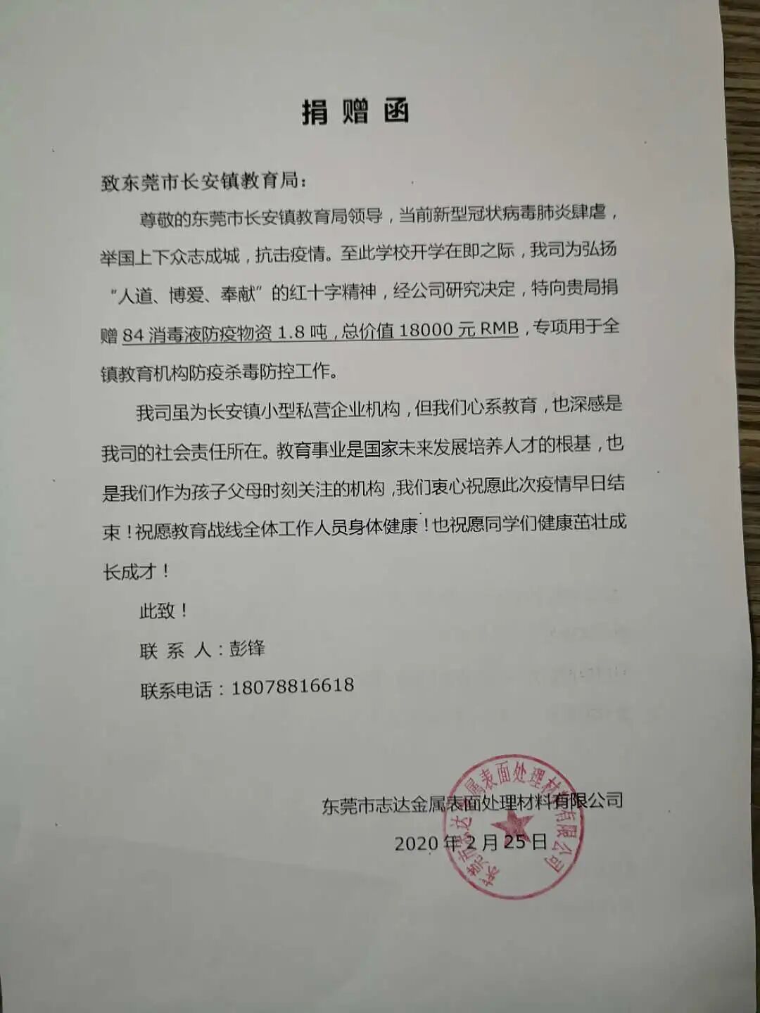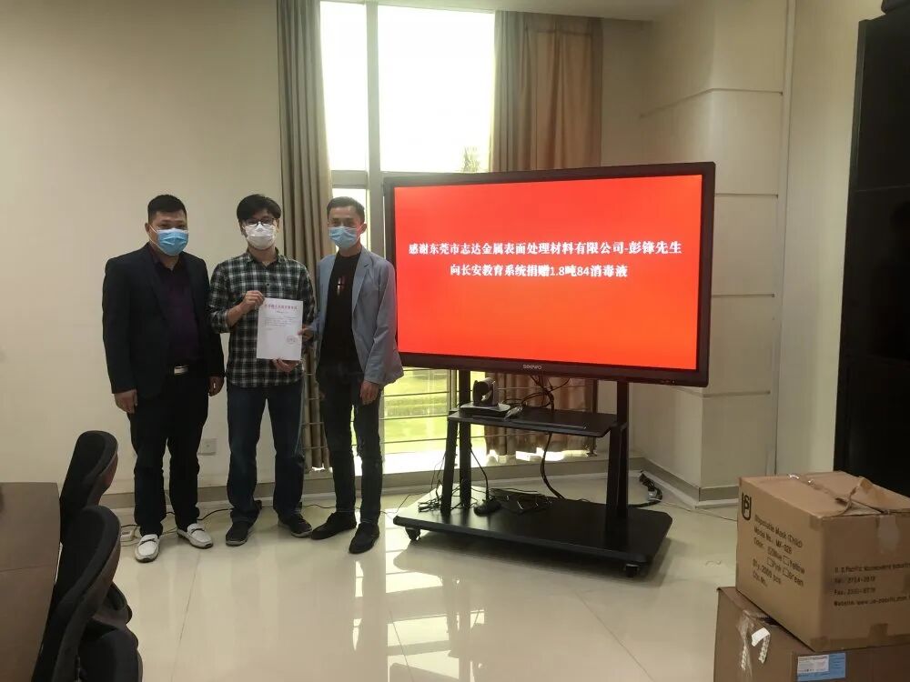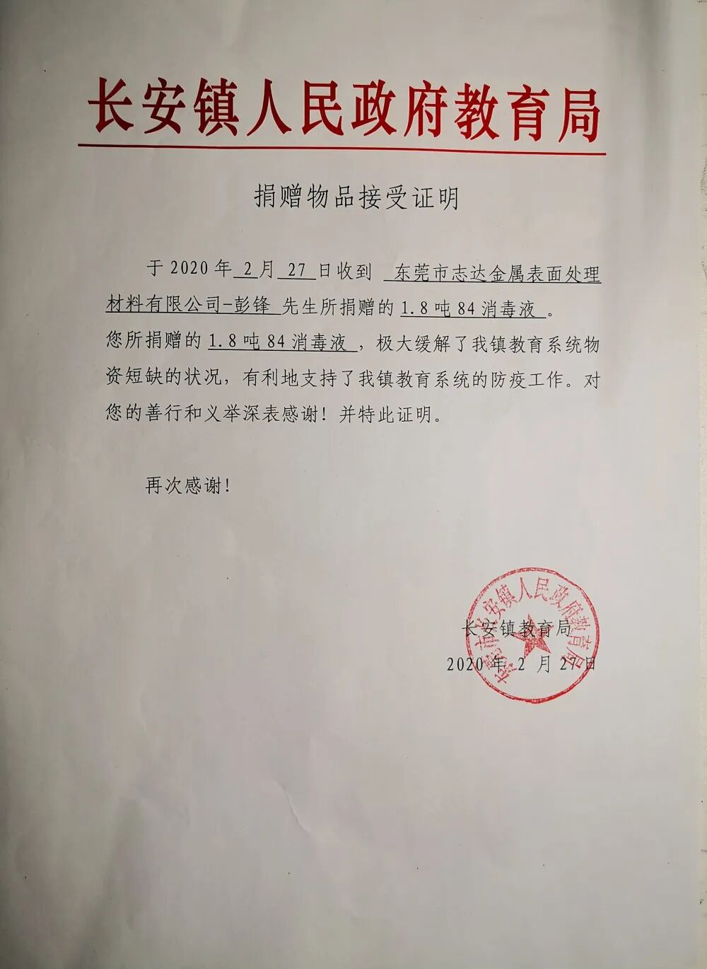 众志成城 抗击疫情 2020年春节一场突如其来的新型冠状病毒疫情牵动着全国14亿人民的心,这场疫情定义为国家“一级战备”状态,对于每一位中国人来说都是不同寻常的一个中国年。 一场疫情体现了中华民族团结共进,众志成城的精神,举国上下同心协力共抗疫情。东莞市志达金属表面处理材料有限公司作为社会的一份子,也深感自身的社会责任所在,我们希望能为社会尽绵薄之力,一起抵抗疫情。2020年02月27日,志达第三批防疫消毒物资“84消毒液1.8吨”定向捐赠给东莞市长安镇教育局,用于全镇104所学校消毒专用,交接仪式于3.2日完成。